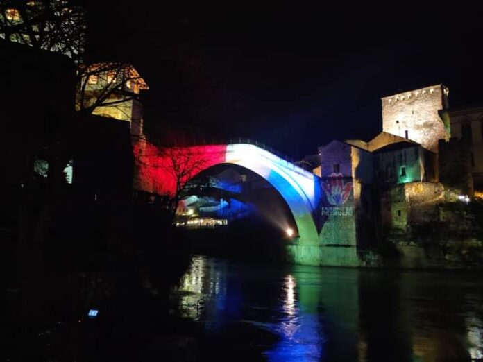 STARI Most u Mostaru sinoć je prvi put u svojoj povijesti zasvijetlio u bojama zastave Republike Hrvatske.