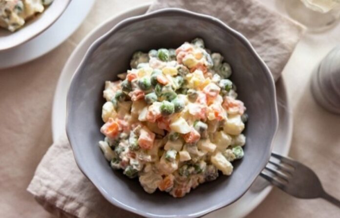 Za to vrijeme nasjeckajte kisele krastavce. Jabuke operite, ogulite i narežite na kockice. U duboku zdjelu stavite kuvano povrće, krastavce, jabuke, pavlake, senf i majonezu te sve dobro promiješajte. Ako je potrebno dodajte so i biber po ukusu.