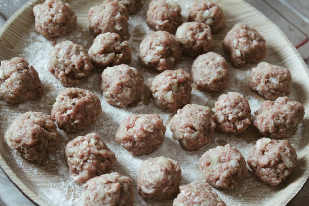 Prelijte vrhnjem za kuhanje pa dodajte kašiku ajvara. Nakon toga izvadite meso iz frižidera i pravite male kuglice približno iste veličine.