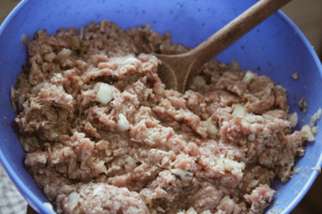 Pomiješajte mljeveno meso sa jednim jajetom pa dodajte sitno isjeckan luk.