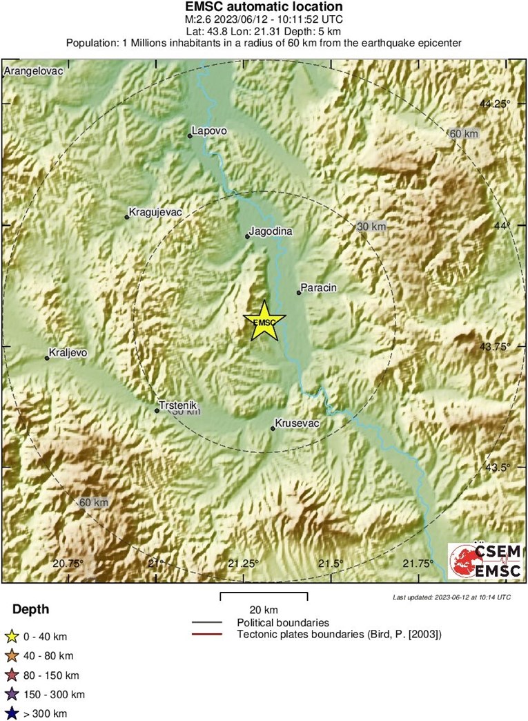 Potresi ovakvog intenziteta mogu izazvati mala oštećenja na objektima u epicentru, dodaju. Epicentar je 44 kilometra od Kragujevca.