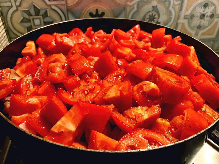 Zadnjih nekoliko godina smo cijeli postupak drastično pojednostavnili, a rezultat je, rekli bismo, bolji. Dakle, sirove i oprane pamidore režemo na komade od nekoliko centimetara te ih takve ubacujemo u teću s maslinovim uljem i šufiganom kapulom. Na laganoj vatri i uz povremeno miješanje oni puštaju svoj sok i kužinom se začas proširi neodoljiv miris.