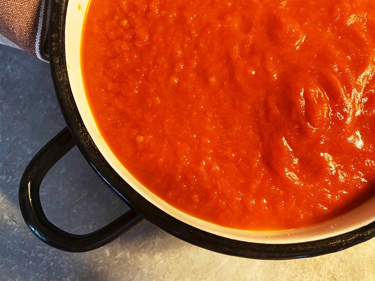 Nakon što smo dodali pamidore na laganoj vatri, oni su polako pustili svoj sok i čarolija stvaranja šalše je započela. Kuhali smo odjednom deset kila u dvije teće od kojih je jedna, ona teška crna, pripadala pokojnoj babi pa, iako u njoj šalšu treba češće miješati da se ne zalijepi za dno, od nje nikako ne odustajemo, a neki se kunu da je bolja nego ona iz teće do.