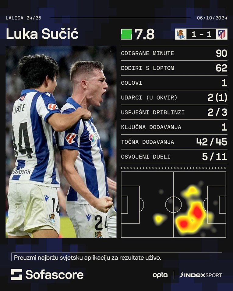 HRVATSKI reprezentativac Luka Sučić (22) prelijepim je pogotkom izjednačio rezultat na utakmici svojeg Real Sociedada protiv Atletico Madrida u remiju 1:1. Ofenzivni veznjak Sučić, koji je igrao u prvoj postavi, potegnuo je u 84. minuti s više od 20 metara lijevom nogom.