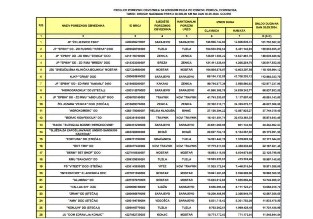 U Federaciji BiH postoji 5.109 pravnih lica koje imaju dug po osnovu poreza, doprinosa, taksi i drugih naknada od preko 50.000 KM. Oni duguju ukupno 2,6 milijarde maraka.