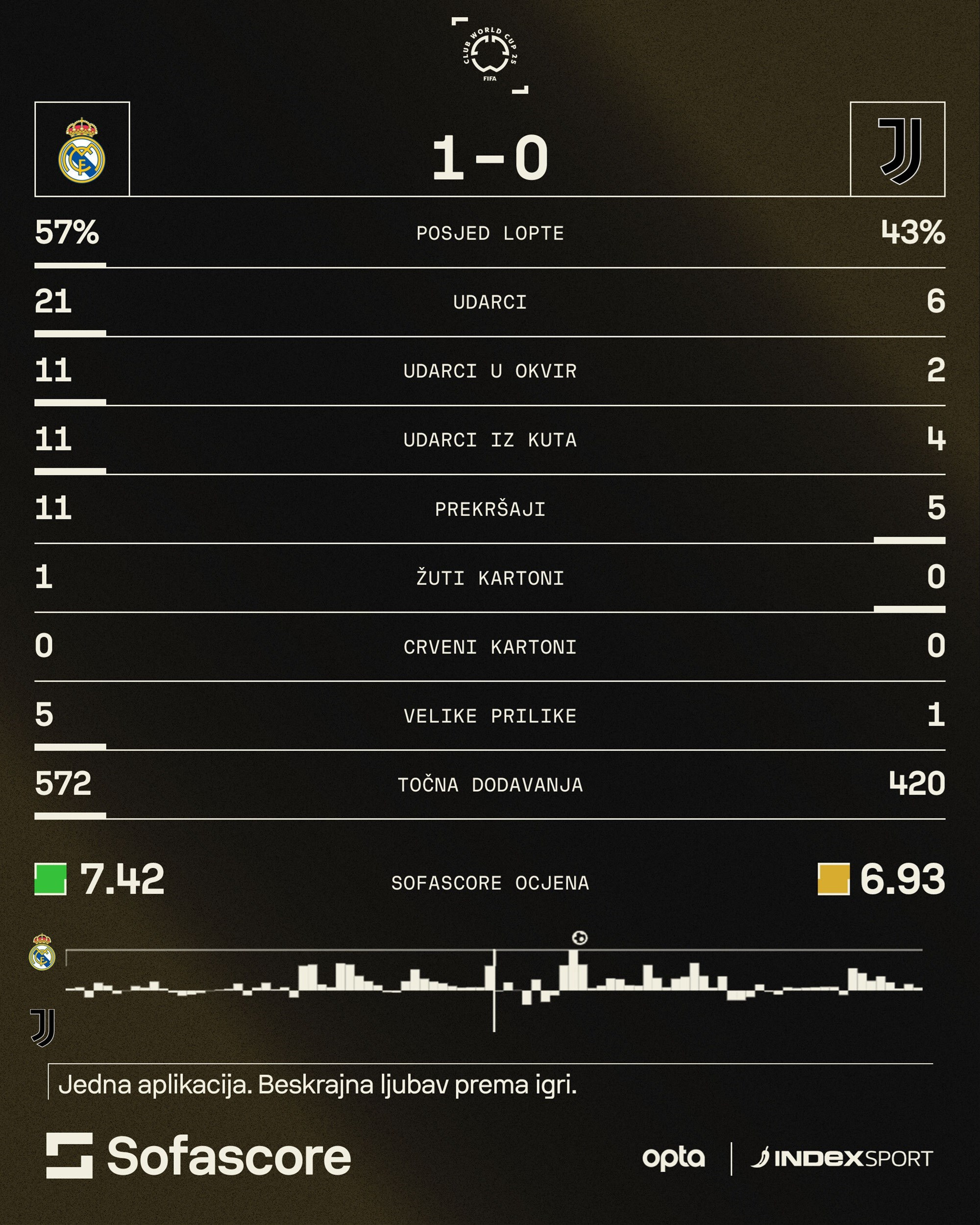 Alexander-Arnold odlično je ubacio s desne strane, a najviši u skoku bio je Gonzalo Garcia koji glavom pogađa za vodstvo Reala. Imale su obje momčadi u idućih 10-ak minuta nekoliko prilika, ali mreže su mirovale. Real je postao opasniji ulaskom Mbappea, koji je u paru s Viniciusom radio velike probleme obrani Juventusa, no, nisu uspjeli zabiti i drugi gol koji bi sve riješio i prije zadnjeg sučevog zvižduka.