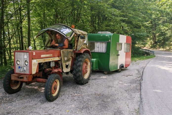 PRIJEDOR – Neobična priča danas je izmamila osmijehe ali i radoznalost mještanima Kozarca kod Prijedora. U glavnoj ulici ovog potkozarskog mjesta, pažnju je privukla nesvakidašnja scena: stari traktor sa, ni manje ni više, njemačkim tablicama, koji vuče starinsku kamp-prikolicu u bojama italijanske zastave.