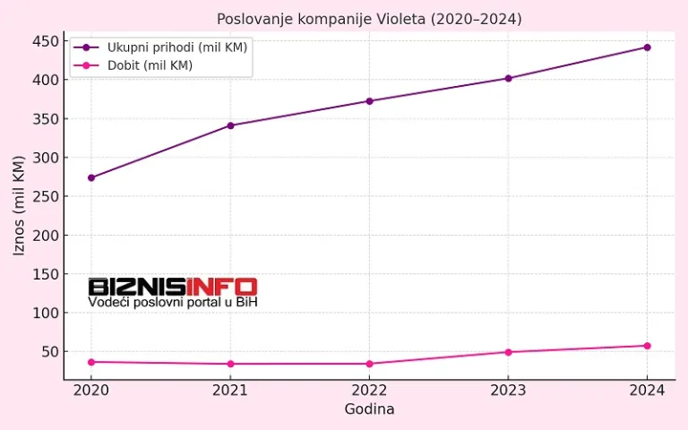 Kompanija „Violeta“ prošle godine je ostvarila prihode od 442 miliona KM. To je za oko 40 miliona više nego godinu ranije, čime je nastavljen kontinuiran trend rasta iz prethodnih godina.
