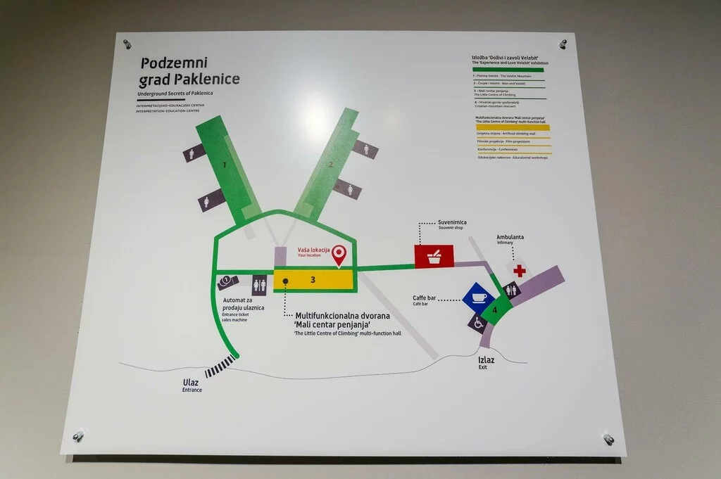Čitava je dvorana posvećena Paklenici kao jednom od najvećih penjališta u ovom dijelu Europe, postavljena je umjetna stijena i predstavljeni su pioniri hrvatskoga alpinizma. Posjetitelji se mogu upoznati i s poviješću i radom HGSS-a te iz prve ruke, odijeljeni tek ekranom, čuti priče zaslužnih gorskih spašavatelja. Podzemni grad Paklenice rijedak je primjer (vrlo) dobre prakse kojom su betonski relikti bivše države dobili novu, primjereniju i puno ljepšu ulogu.