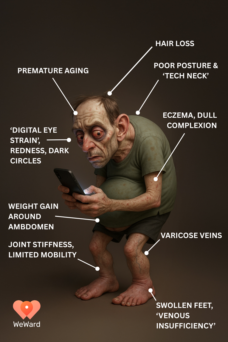 Kako bi ilustrirali moguće posljedice, tim koji stoji iza aplikacije za hodanje WeWard iskoristio je umjetnu inteligenciju za stvaranje Sama – modela čovjeka iz 2050. godine čiji je život obilježen gledanjem u ekran. Njegove glavne karakteristike su gubitak kose, nakupljanje masnoće oko trbuha, ukočeni zglobovi zbog slabe pokretljivosti i izrazito loše držanje.