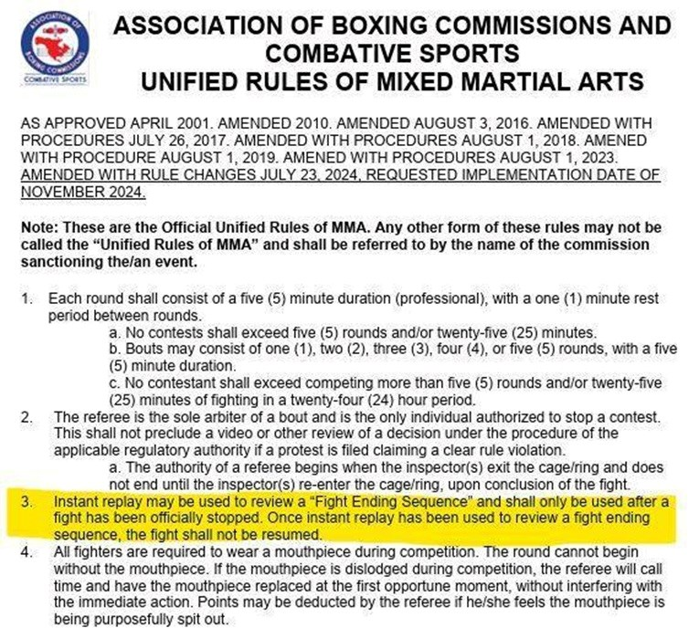 Kao što se vidi iz priloženih pravila MMA-a, članak tri objašnjava: “Snimka može se koristiti za pregled ‘završne sekvence borbe‘ i smije se upotrijebiti samo nakon što je borba službeno zaustavljena. Nakon što je snimka korištena za pregled završne sekvence borbe, borba se ne smije nastaviti.”