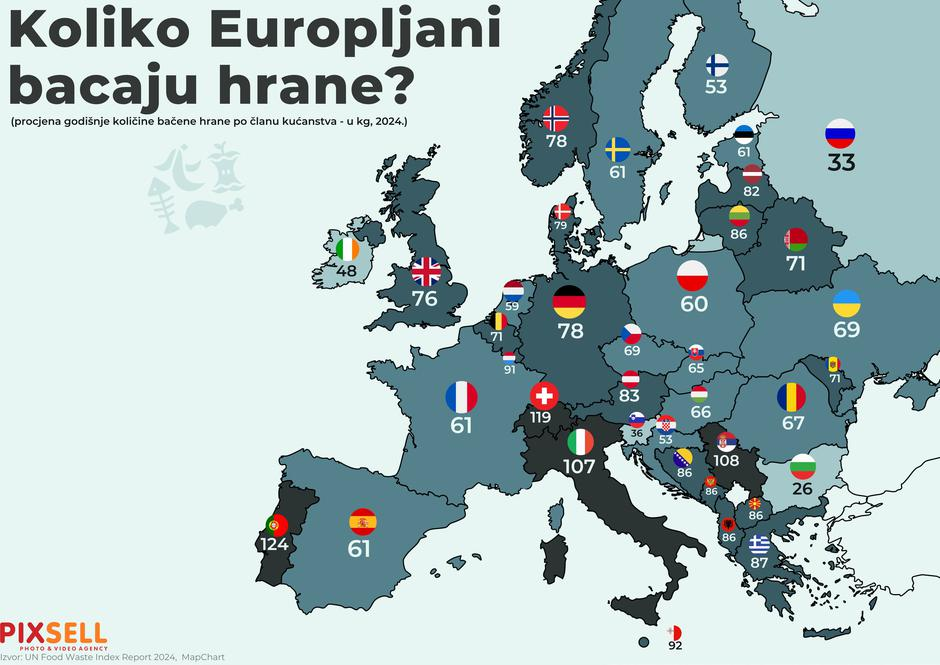 Građani Europske unije godišnje bace čak 59 milijuna tona hrane, što je ekvivalentno 132 kilograma po stanovniku. Ovaj zabrinjavajući trend dovodi do gubitka hrane u vrijednosti većoj od 130 milijardi eura svake godine. Više od polovine ukupnog otpada od hrane dolazi iz kućanstava, dok ostatak čine restorani, trgovine i proizvodne tvrtke. Iako svjesnost o problemu raste, brojke su još uvijek porazne: hrana koja završi u otpadu mogla bi prehraniti milijune ljudi koji si ne mogu priuštiti kvalitetne obroke. Ako promotrimo pojedinačne države, zapažamo značajne razlike. Portugalci bacaju najviše hrane, čak 124 kilograma po stanovniku, dok Švicarci bacaju 119 kg, a Talijani 107 kg. S druge strane, najmanje hrane bacaju Slovenci, Bugari i Rusi, dok Hrvati bacaju 72 kg hrane po stanovniku godišnje.