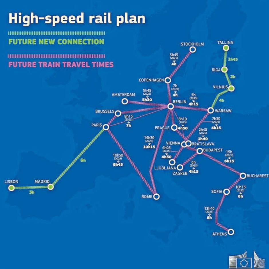 Putnici će moći putovati od Berlina do Kopenhagena za četiri sata umjesto trenutačnih sedam, a od Sofije do Atene za šest sati umjesto trenutačnih 13.40. Nove prekogranične veze također će omogućiti brža i jednostavnija putovanja poput Pariza i Lisabona, preko Madrida, i poboljšanu povezanost između baltičkih glavnih gradova.