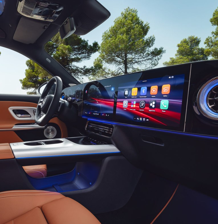 Unutrašnjost novog GLB-a uvelike podsjeća na nedavno predstavljeni CLA. Kao treći model na Mercedesovoj modularnoj arhitekturi (MMA), SUV preuzima novu generaciju infotainment sustava MB.OS. To znači da se ispred vozača i suvozača nalaze tri zaslona koji ne služe samo za navigaciju, već i za zabavu.