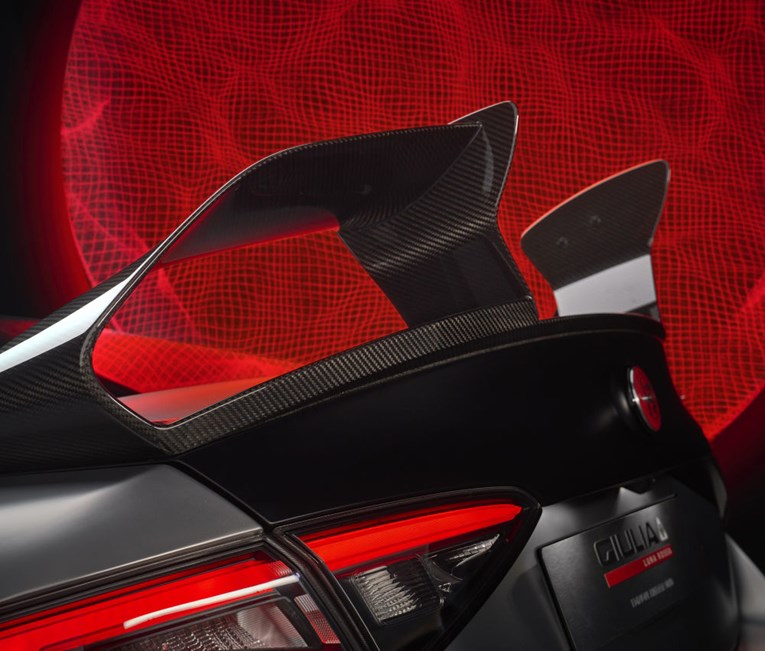 Glavna zvijezda ovog projekta je aerodinamika. Alfa Romeo tvrdi da je ovo najaerodinamičniji Quadrifoglio ikad proizveden. Prednji odbojnik opremljen je karbonskim “kanardima”, podvozje ima nove profile za stvaranje usisa zraka, bočni pragovi optimiziraju protok zraka, a masivno stražnje krilo izgleda kao da je skinuto izravno s jedrilice za America’s Cup.