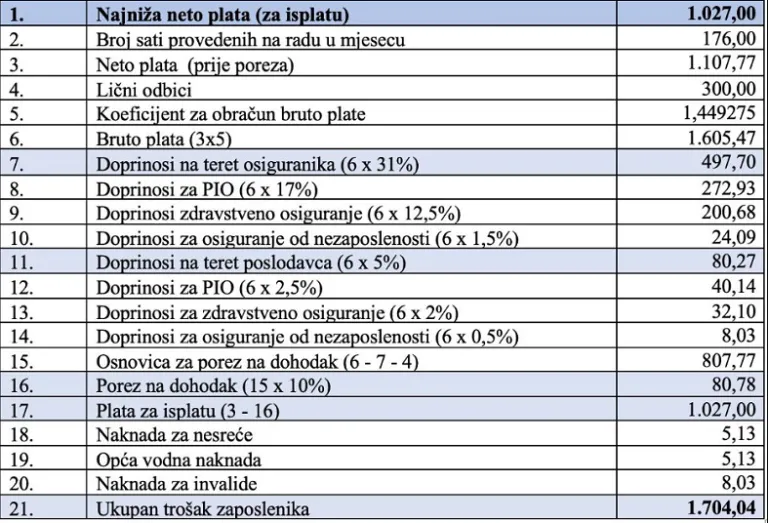 U tabeli ispod možete vidjeti detaljan obračun minimalne plate, uključujući bruto iznos, doprinose, poreze i ostale obavezne stavke koje čine ukupni trošak jedne plate.