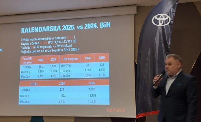 Protekla godina bila je rekordna za Toyotu u Bosni i Hercegovini, jer je kompanija isporučila ukupno 1.360 vozila, što je najbolji rezultat od početka poslovanja na domaćem tržištu i što je Toyoti po prvi put donijelo drugo mjesto u ukupnoj prodaji vozila u BiH uz tržišni udio od 11,2 posto. Toyota je četvrtu godinu zaredom bila najprodavaniji brend putničkih automobila u Bosni i Hercegovini, s tržišnim udjelom od 15,4 posto, dok je istovremeno nastavila snažan rast u segmentu elektrificiranih vozila, isporučivši 818 takvih vozila, što čini 60 posto ukupne prodaje u 2025. godini.