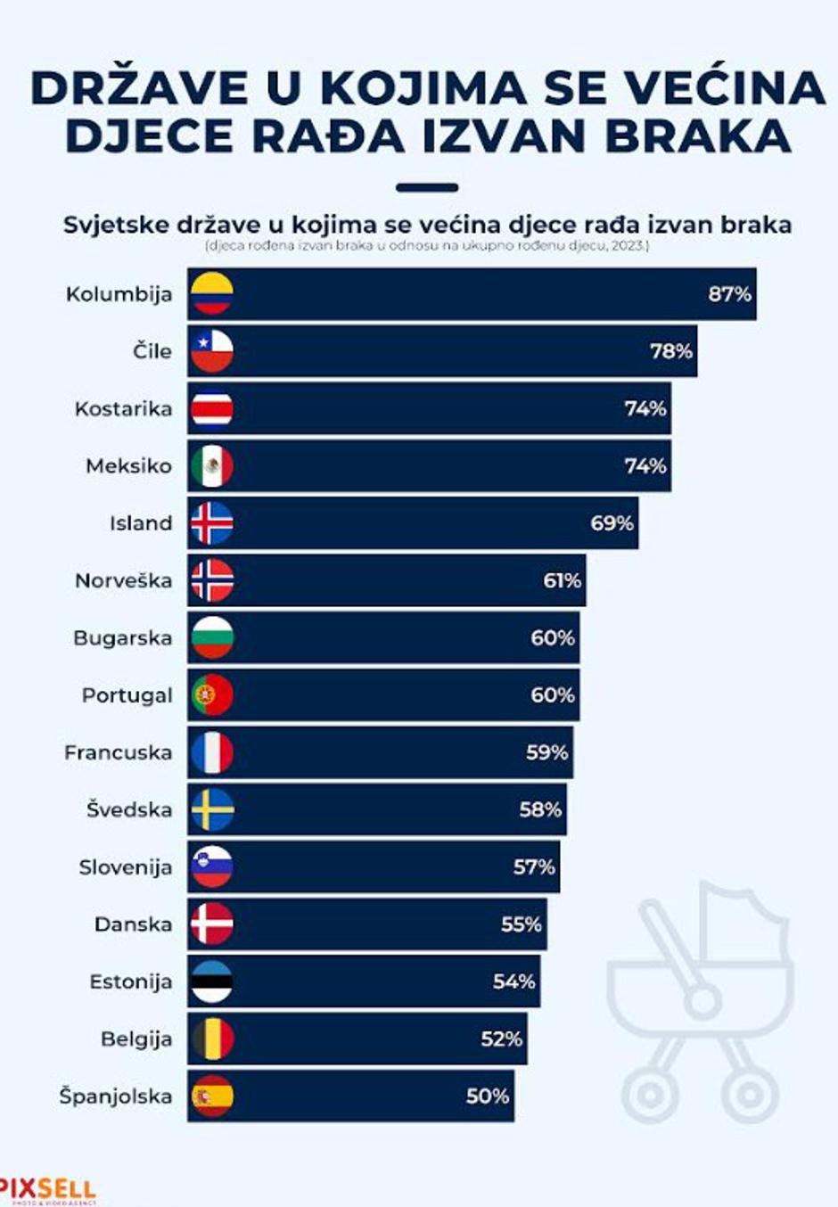 Infografika prikazuje udio djece rođene izvan braka u odnosu na ukupan broj rođenih u odabranim zemljama, prema podacima iz 2021. godine.