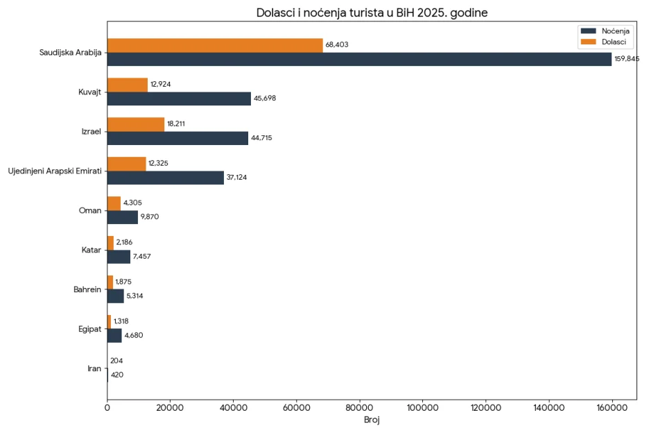 Turisti iz pojedinih bliskoistočnih država su značajni za bh. turizam, odnosno ekonomiju, a to je ono što potvrđuje i zvanična statistika. Naime, turisti iz devet bliskoistočnih zemalja su prošle godine ukupno imali 121.751 dolazak i 315.123 noćenja.