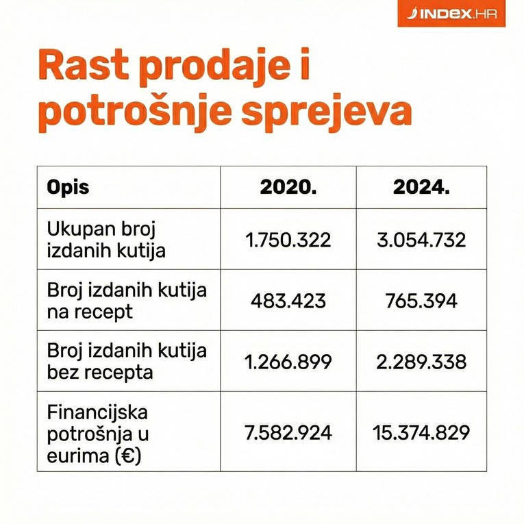Posljednjih godina bilježi se zabrinjavajući porast broja osoba ovisnih o sprejevima za nos. Podaci HALMED-a potvrđuju ovu tendenciju. Od 2020. do 2024. godine prodaja i potrošnja nosnih sprejeva porasla je za gotovo 75 posto.